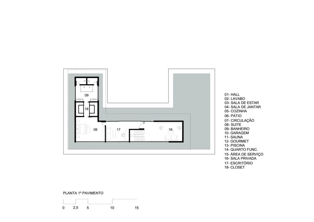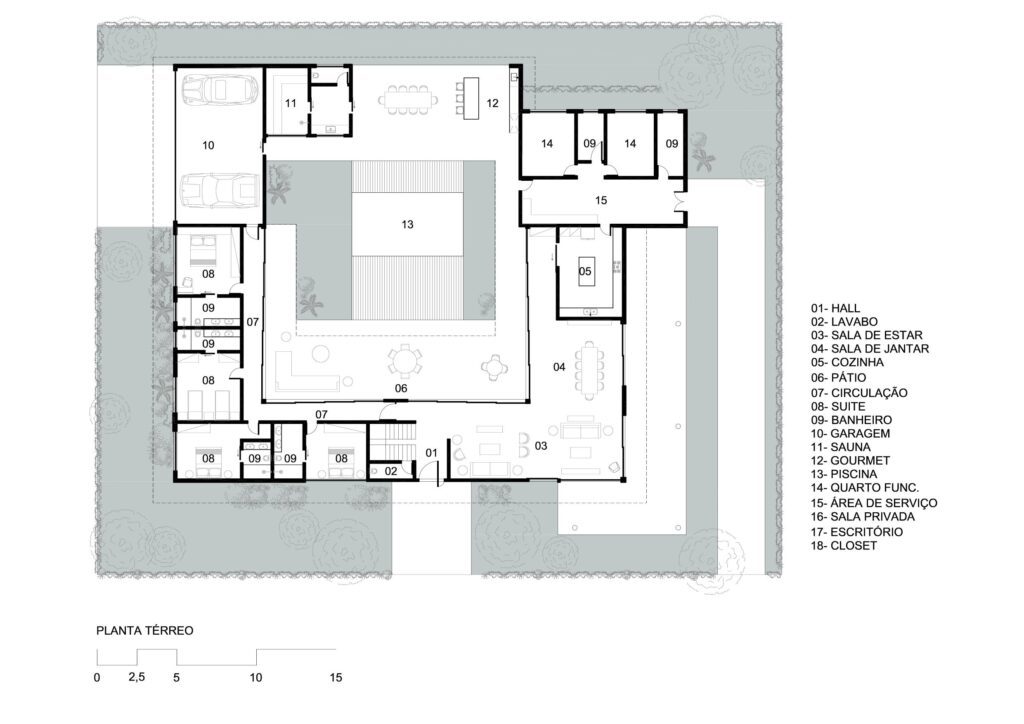 Os quartos, voltados para jardins secretos que margeiam os limites do terreno, encontram no verde um refúgio silencioso, desenhado pelo paisagismo como uma moldura natural para a casa. Ainda assim, mesmo nos corredores que conectam esses espaços íntimos, a ideia de integração ressurge: os trajetos não são meramente funcionais, mas sutilmente conectam o viver privado ao social.