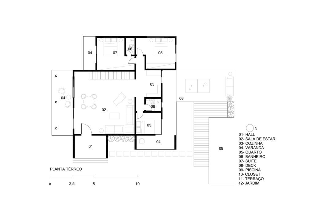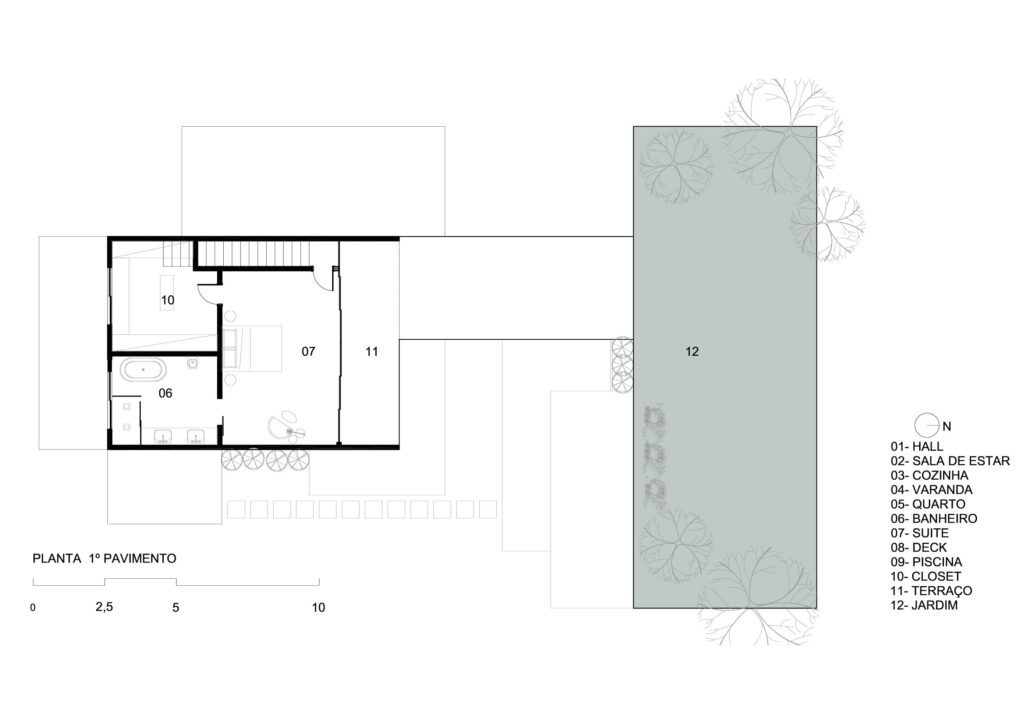 O terreno, com um grande desnível, foi aproveitado da seguinte forma: na parte mais baixa, localiza-se a maior parte do programa da casa, como as suítes, sala de estar, cozinha, piscina e área de lazer; já na parte mais alta, alinhada ao segundo andar, está a suíte principal, conectada a um jardim elevado e intimista por uma ponte