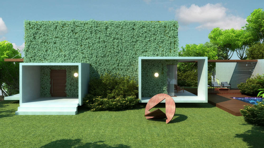A proposta para essa residência é uma arquitetura de formas essenciais. A volumetria cúbica, protegida por vegetação, é intercalada por cubos menores em concreto, criando uma composição plástica e elegante que reflete a contemporaneidade.
