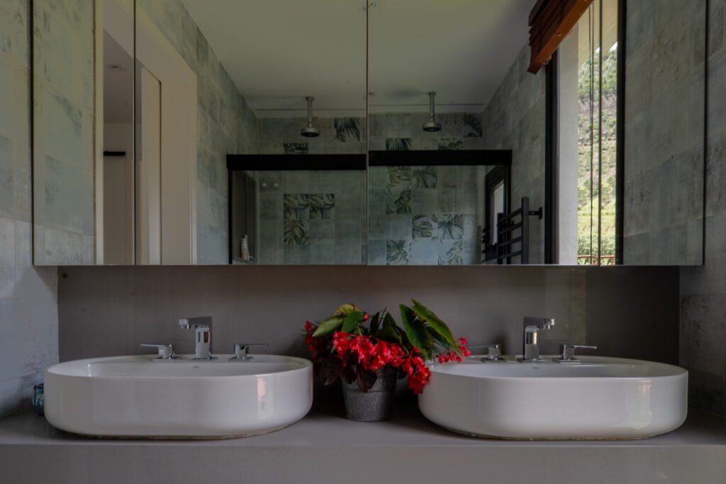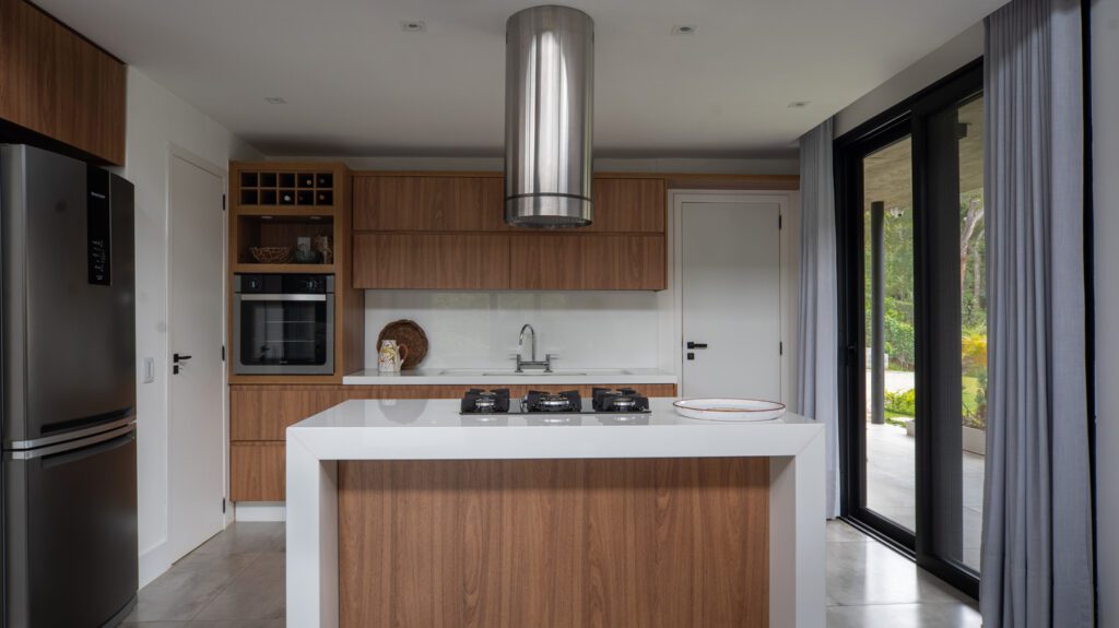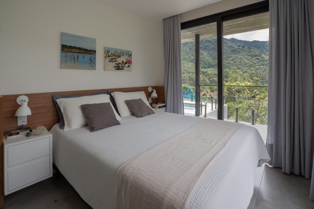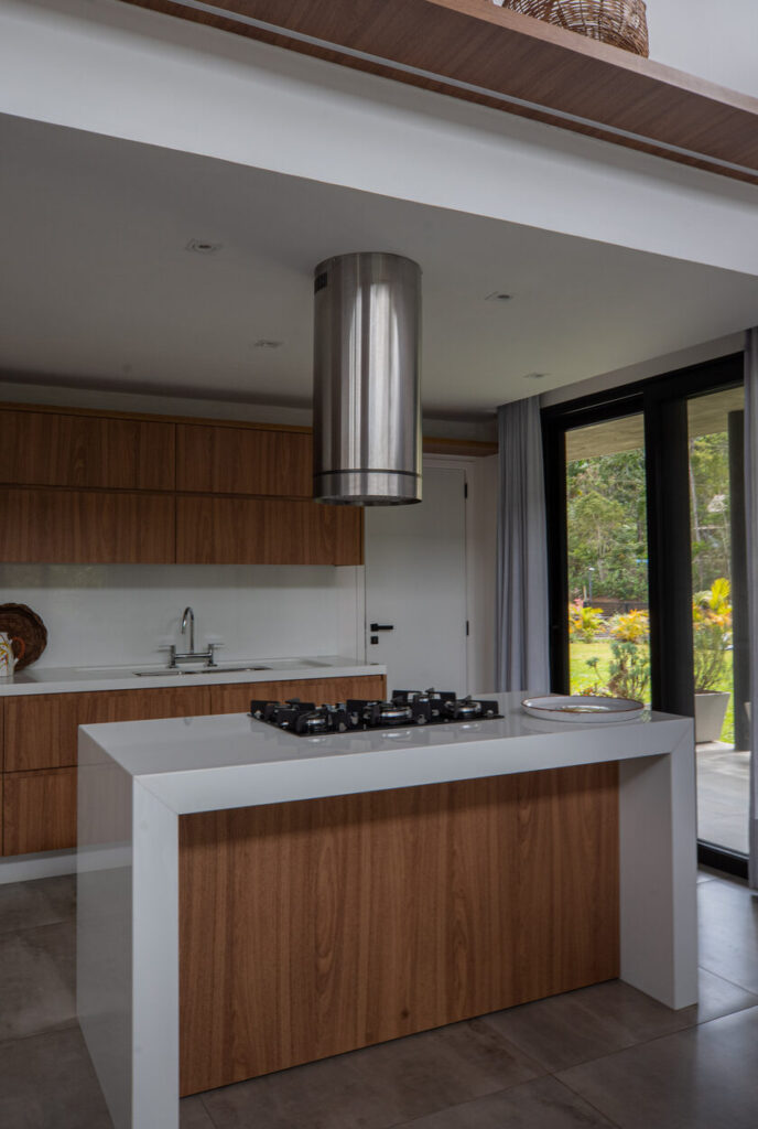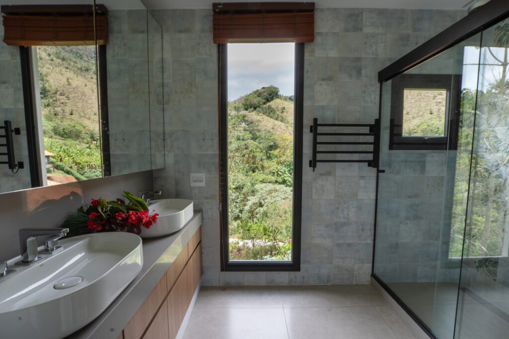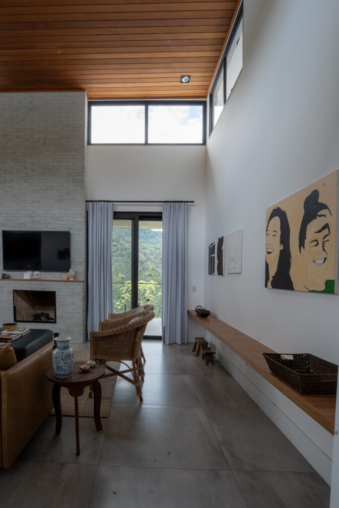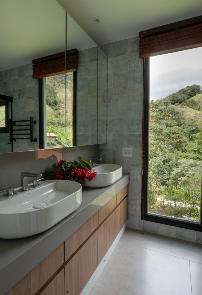 A natureza participa de todos os ambientes: os quartos e até o banheiro da suíte possuem grandes vãos, permitindo que, mesmo em dias frios, a vista esteja sempre presente. Essa integração foi pensada para que a vida na casa flua em sintonia com o entorno, criando momentos de conexão e contemplação