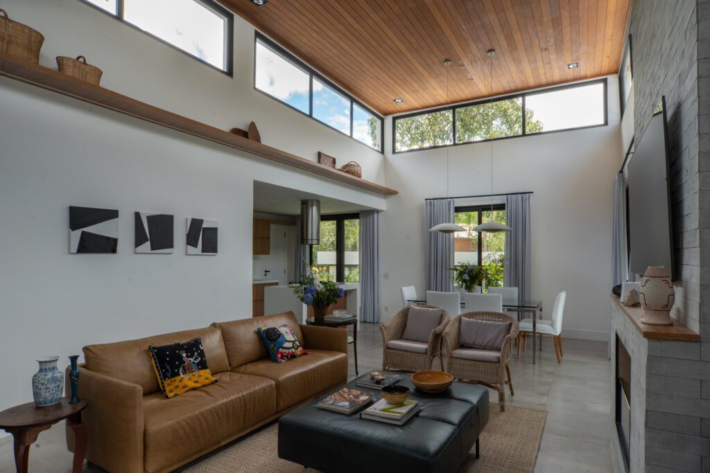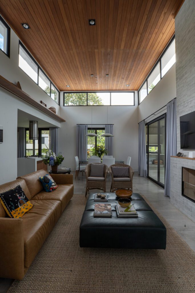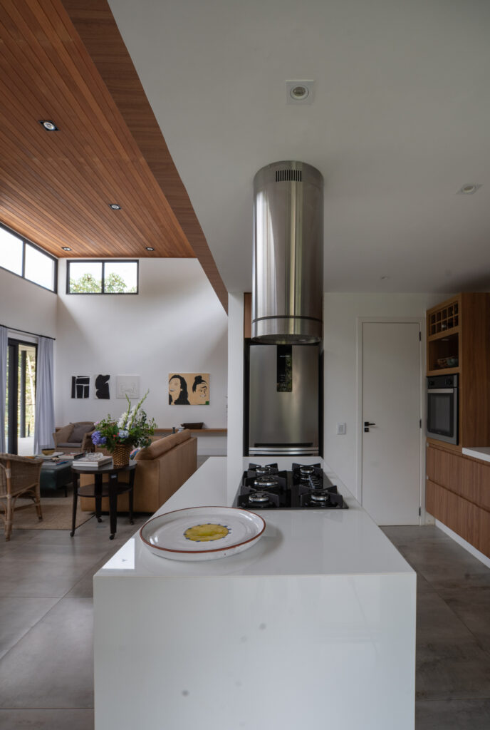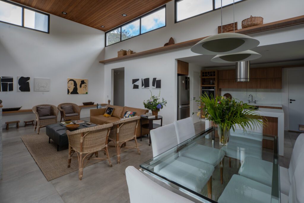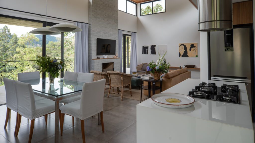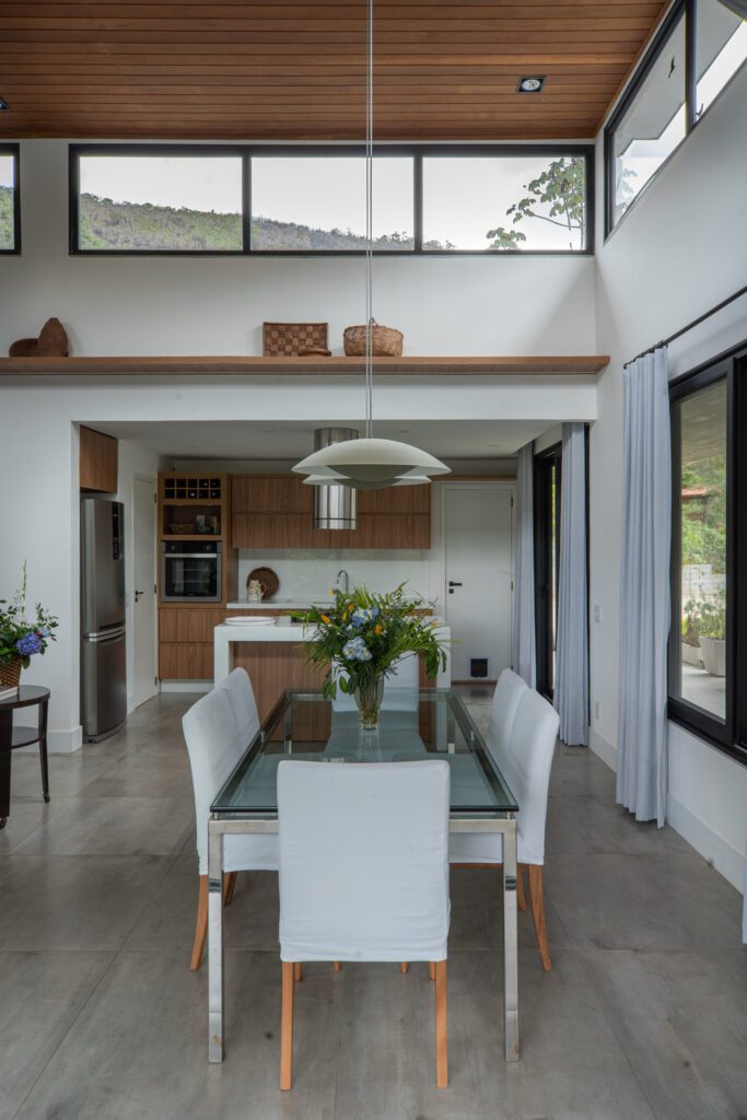 Para isso, o projeto elevou o pé-direito das áreas sociais e envolveu o volume com fitas de vidro, permitindo uma visão panorâmica contínua do céu e da paisagem. Sala de estar, jantar e cozinha ocupam um único espaço integrado, que se abre generosamente para as varandas e para o vale à frente, dissolvendo os limites entre interior e exterior.