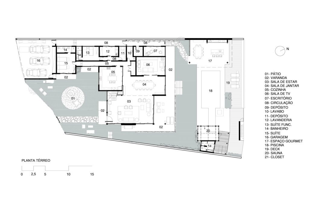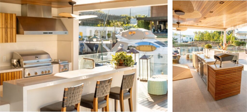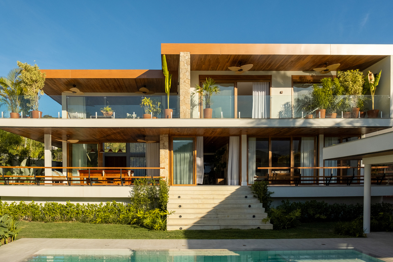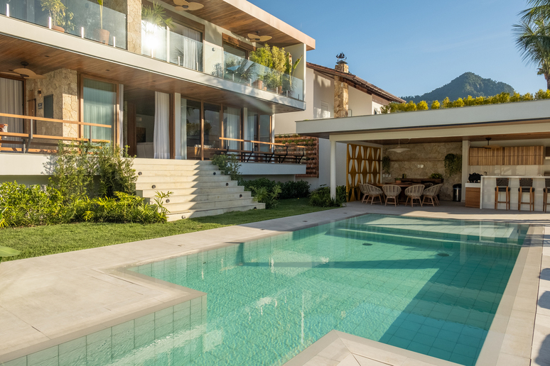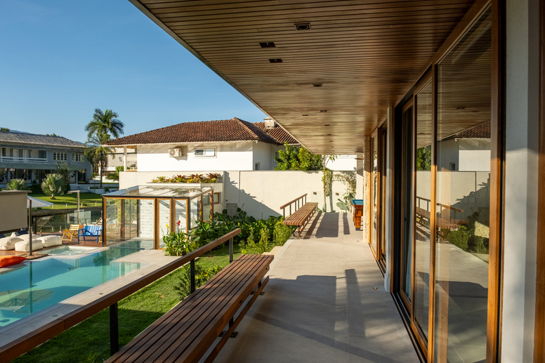 O lado oposto da área externa é voltado para um canal do condomínio, e, em frente à casa, projetamos um espaço para a ancoragem do barco da família, com uma escada de acesso ao deck da piscina.