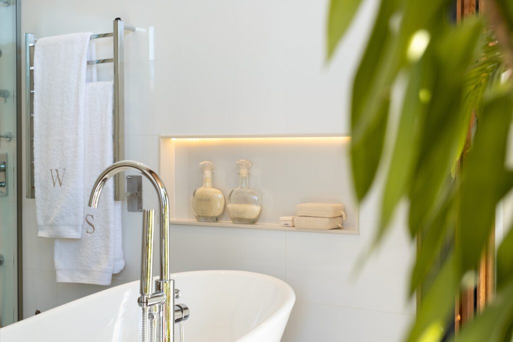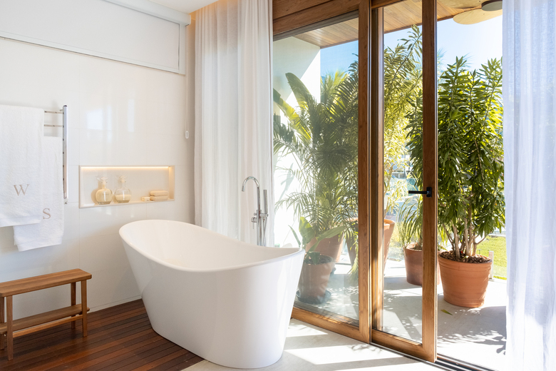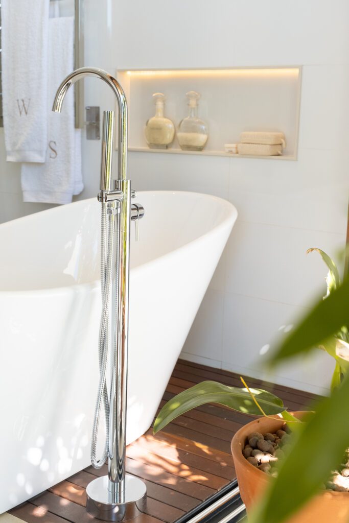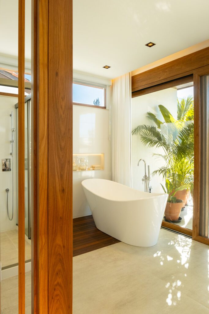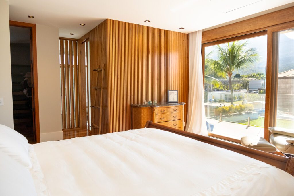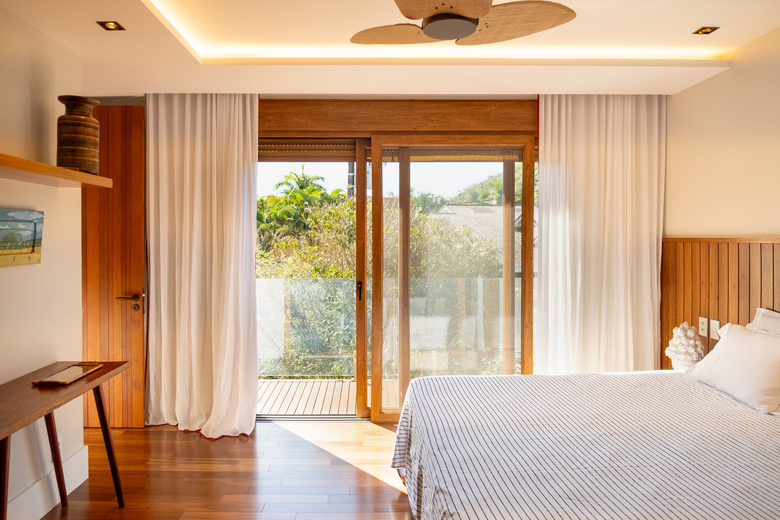 O quarto principal foi projetado como um espaço quase independente, com área de estar, pequeno escritório, generoso closet e um belo banheiro voltado para a vista e para a varanda compartilhada com o quarto.