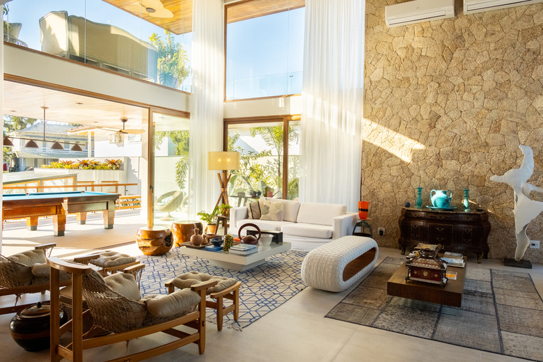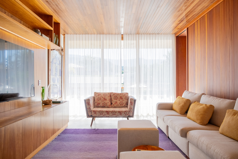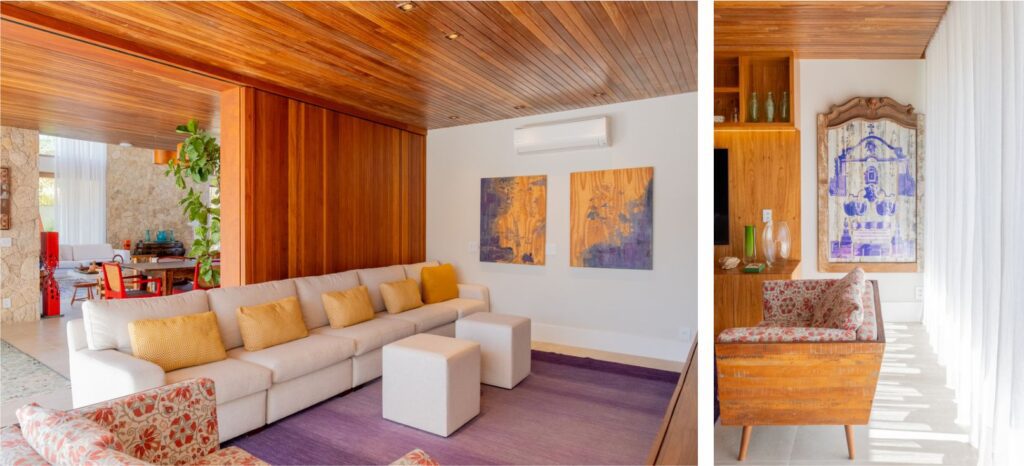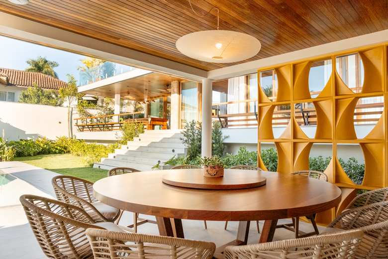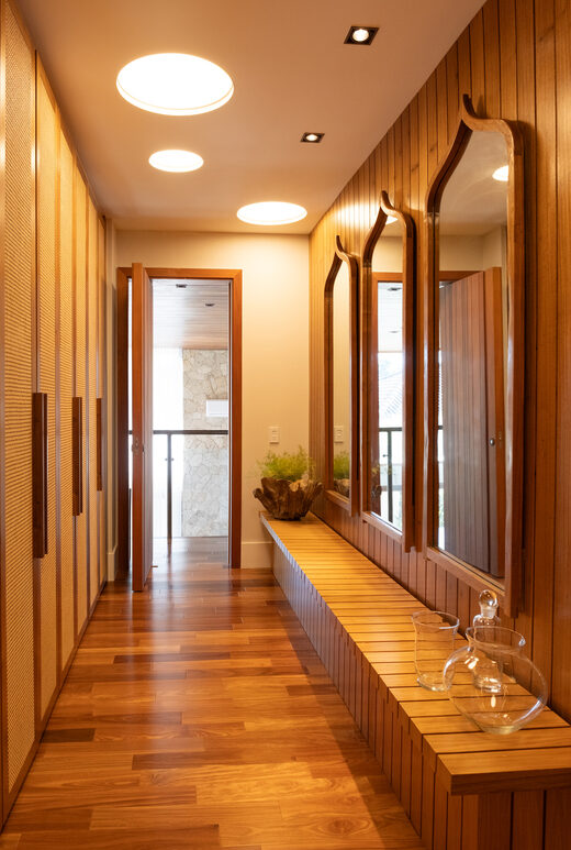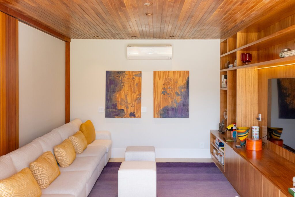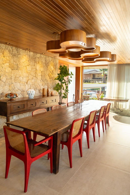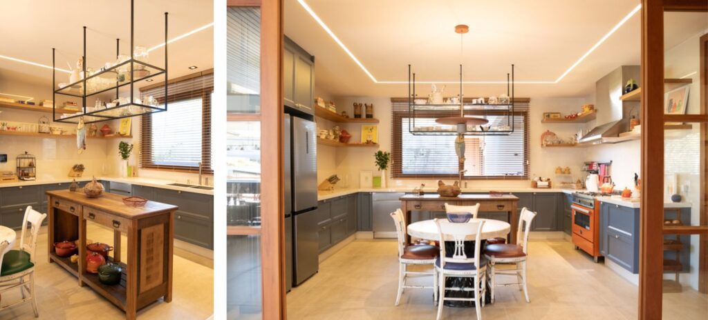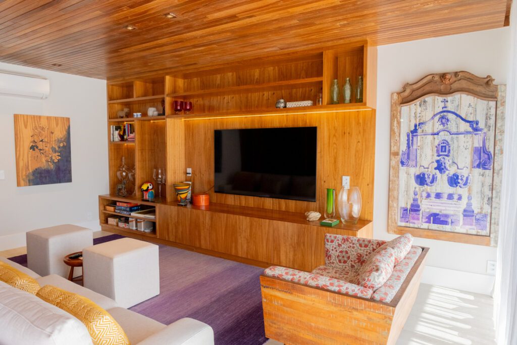 A sala de TV e a cozinha foram projetadas para se integrar à área social, com grandes portas de madeira
