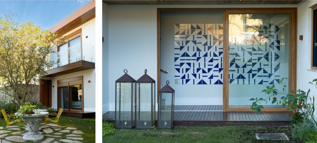 Dedicamos atenção especial à área externa, criando ambientes para diversas atividades. Próxima à entrada, criamos uma praça para refeições intimistas