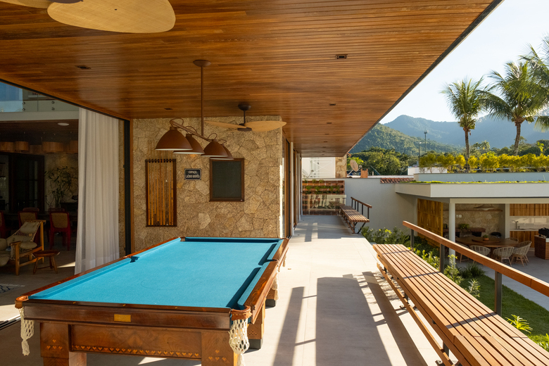 Além da piscina, esta área conta com uma ampla área gourmet, sauna e dependências de apoio, incluindo banheiro e área de repouso para os usuários.