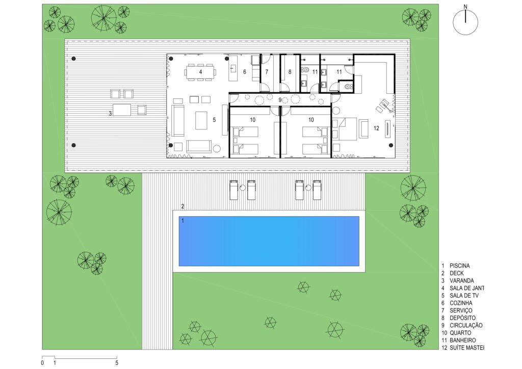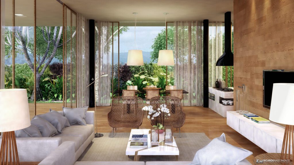 No térreo, ligeiramente elevado, a varanda dá acesso à área social, onde grandes portas de correr envidraçadas se abrem completamente, ampliando a integração entre o interior e o exterior.