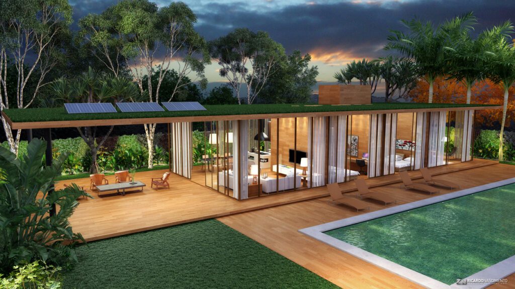 Na materialidade, destaca-se o uso de madeira certificada nos pisos e paredes divisórias, além de vidro e pilares metálicos aparentes. Em vez de muros, arbustos naturais são utilizados nas divisas dos lotes, entre telas.