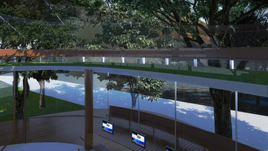No interior, incluímos uma ampla sala no piso térreo com computadores para pesquisa, complementada por um mezanino no segundo andar, que abriga a biblioteca. Um terceiro andar foi dedicado a exposições e palestras. Optamos por utilizar a transparência de forma extensiva, conectando o interior ao exterior e criando uma fluidez que traz a paisagem para dentro do espaço.