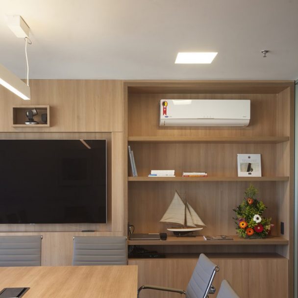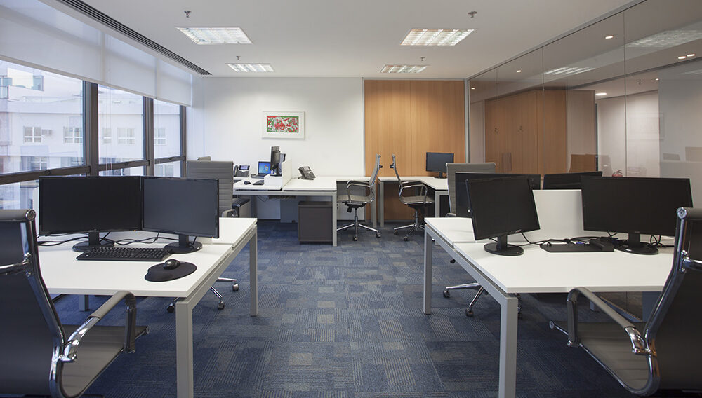 A solução de balcão em “L” garante organização e discrição, protegendo equipamentos e atividades do olhar de quem circula pelo espaço, sem perder a integração com a dinâmica do escritório.