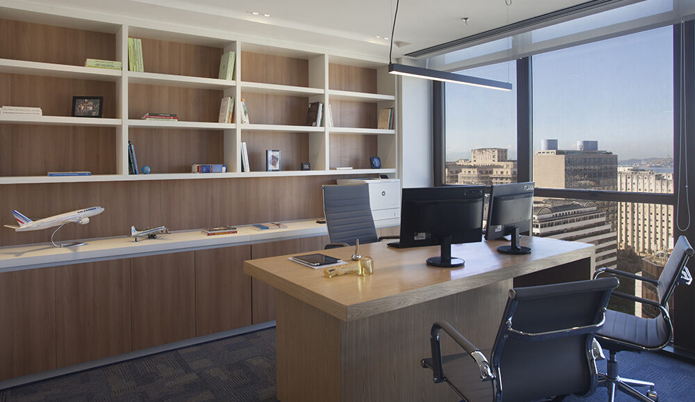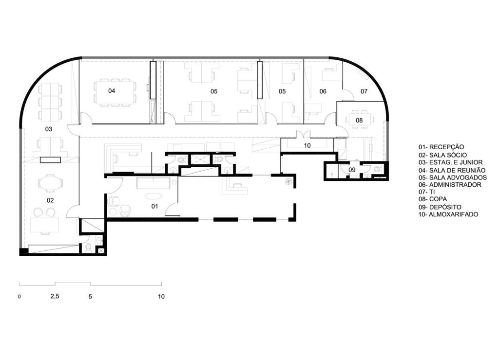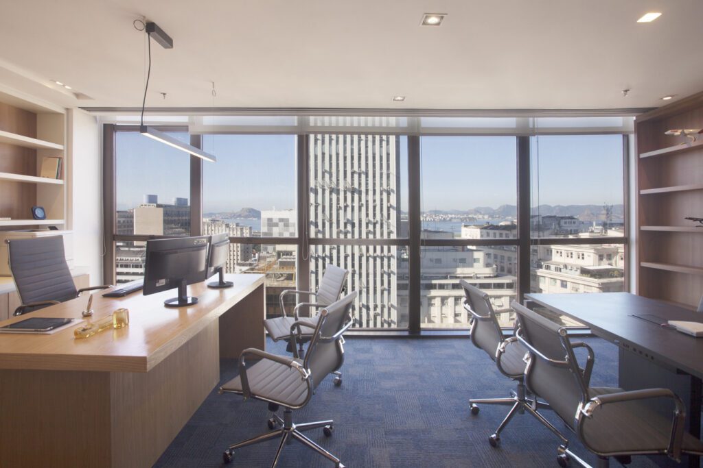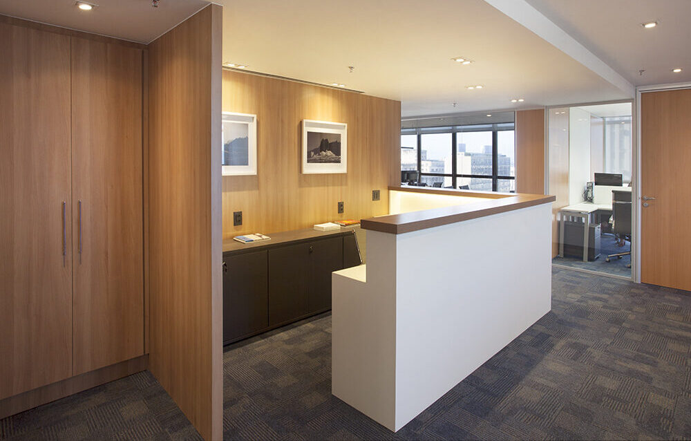 As salas de advogados, voltadas para a vista espetacular, transformam o trabalho diário em uma experiência visual privilegiada. Ao centro, uma área estratégica concentra as três secretárias da equipe.