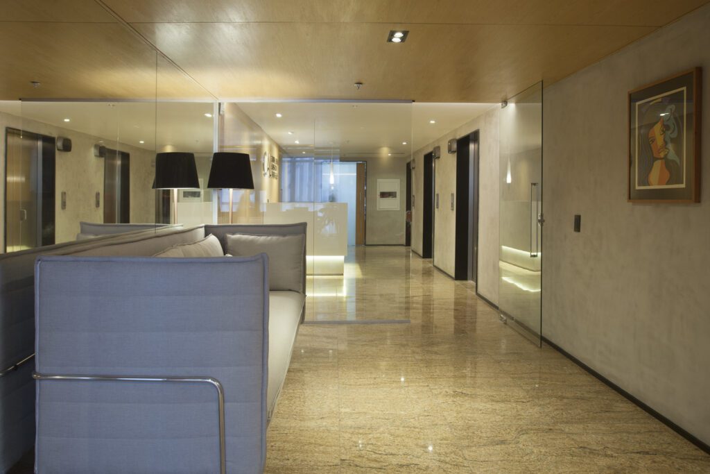A recepção, ponto de chegada e cartão de visita, foi pensada como uma área de acolhimento genuíno. Um estar elegante e confortável recebe clientes e visitantes, permitindo que aguardem reuniões com tranquilidade quase como se estivessem num lounge privativo de um hotel.